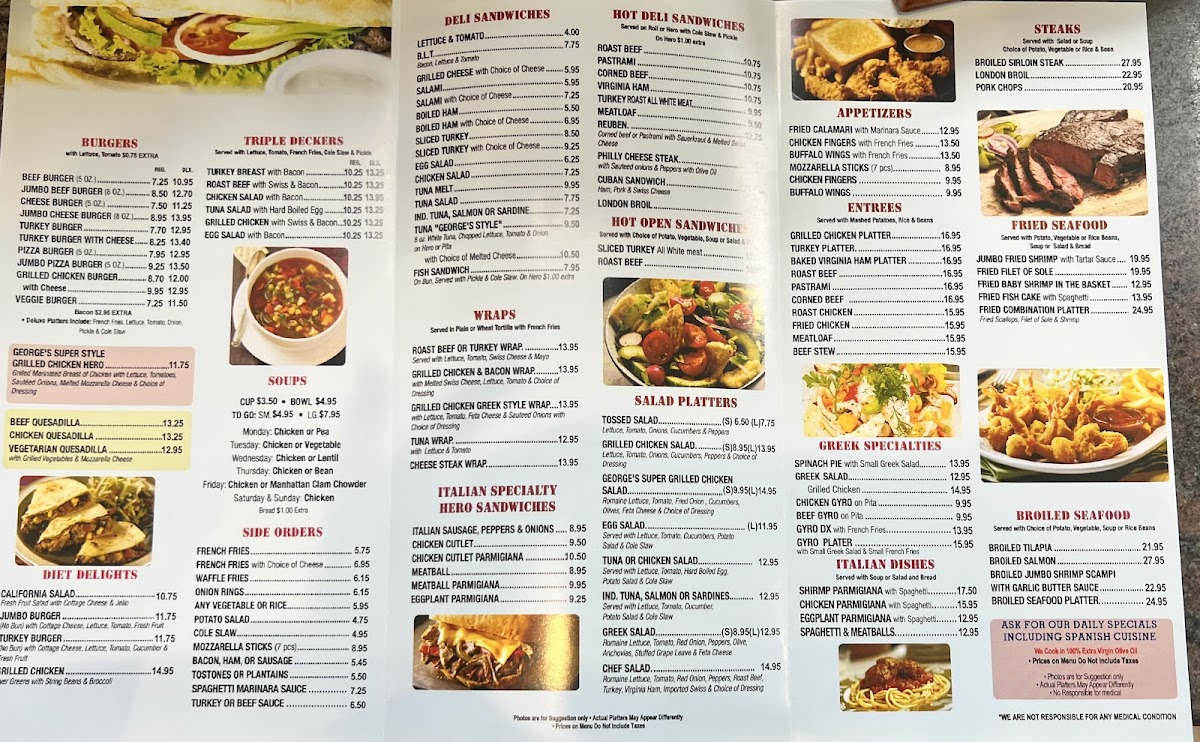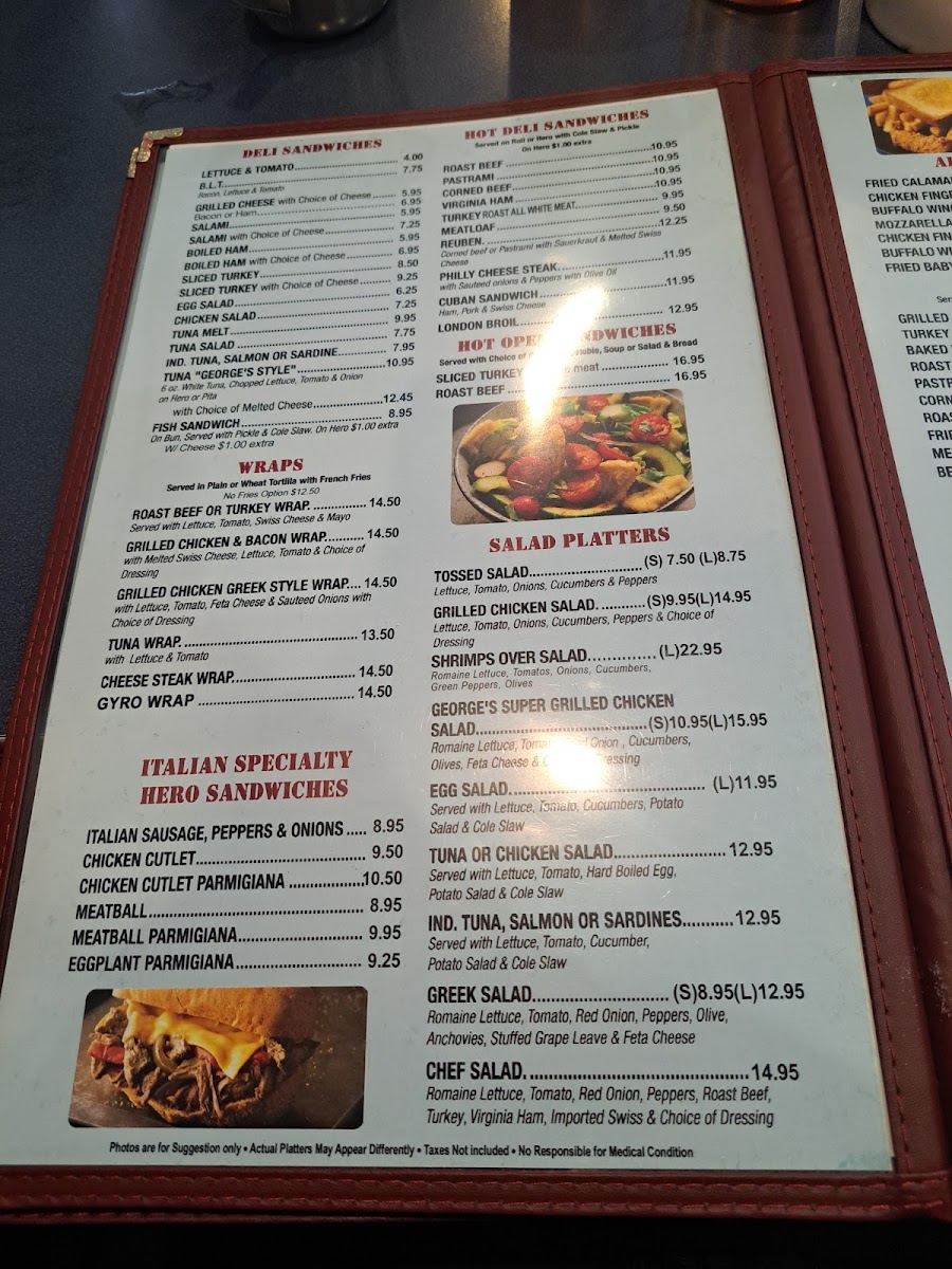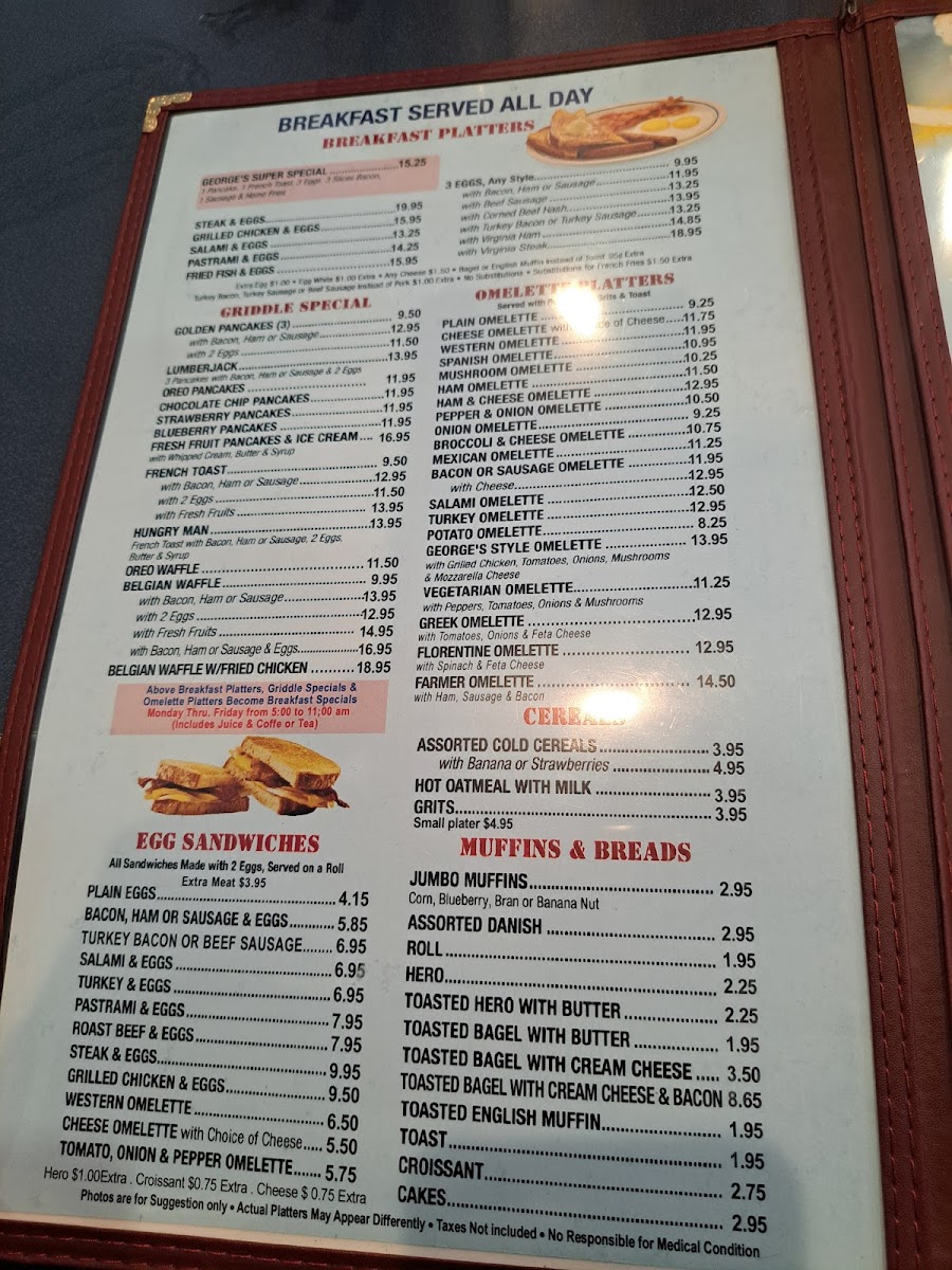 Salad platters stand out too, especially the Greek Salad with romaine, olives, feta cheese, and stuffed grape leaves, showcasing fresh Mediterranean notes. The welcoming atmosphere, complimented by attentive staff, makes every visit feel like home. Dishes such as the grilled corn muffin and the onion omelette linger fondly in memory. George’s Diner delivers not just meals, but memories—comfort food served with warmth, making it a must-visit for both locals and newcomers alike.
