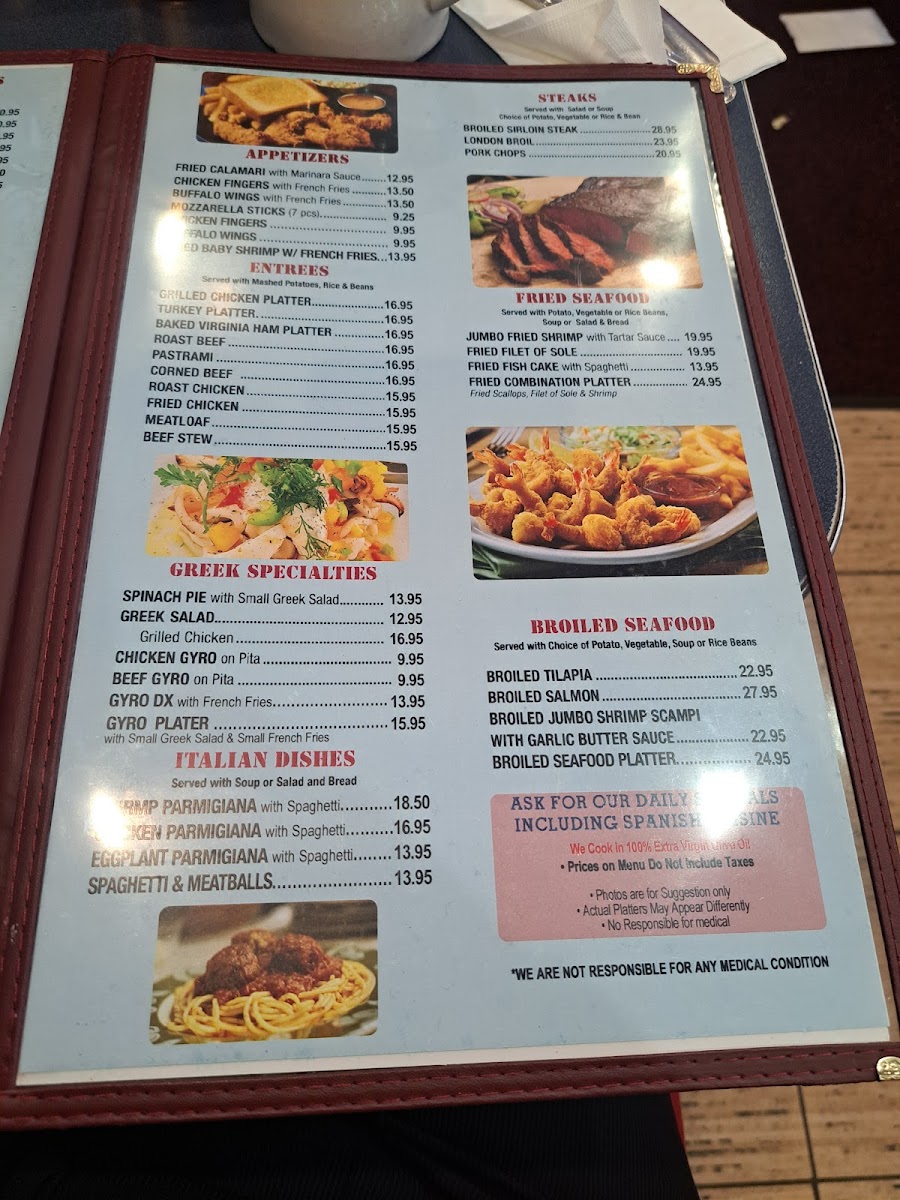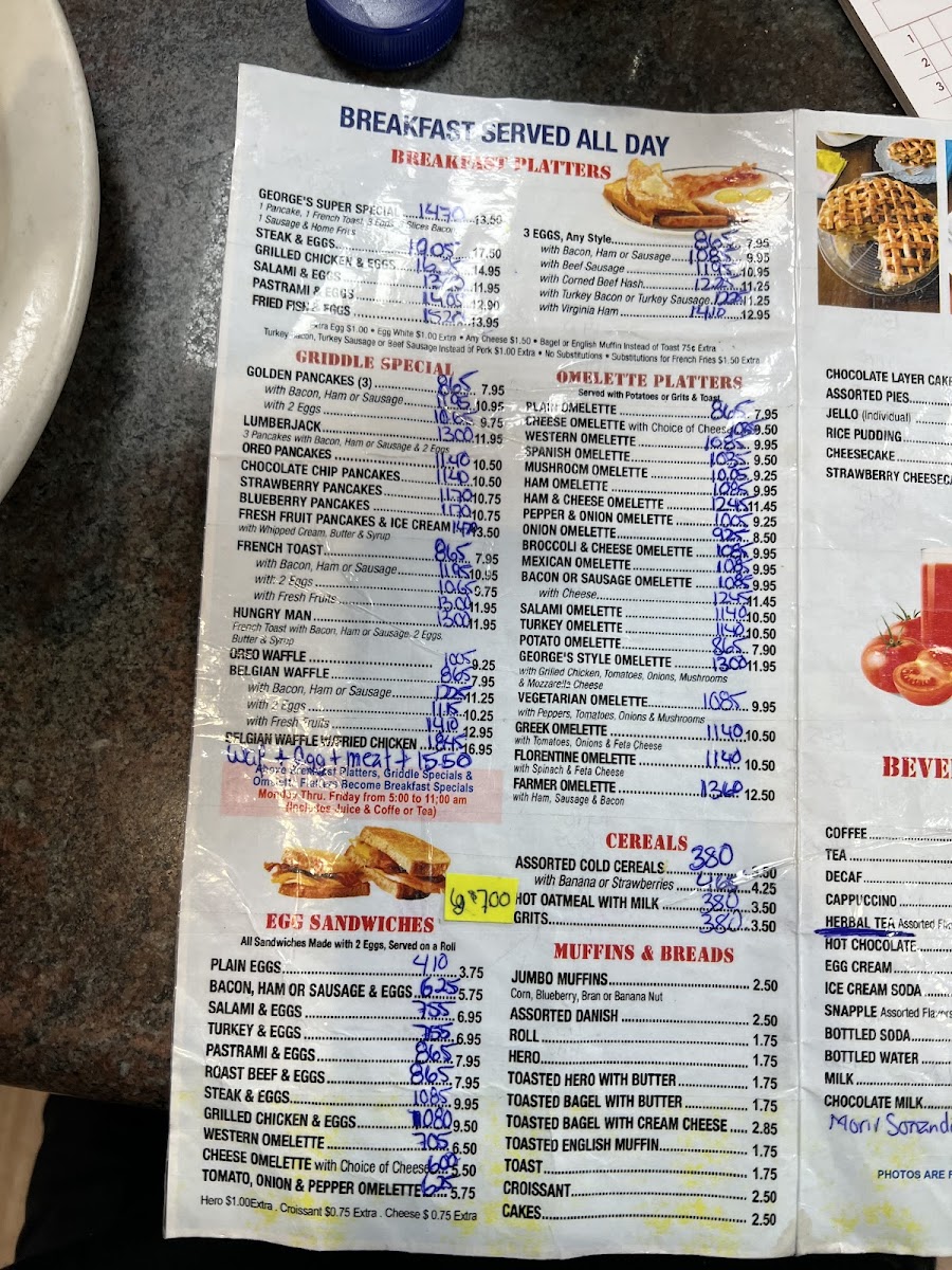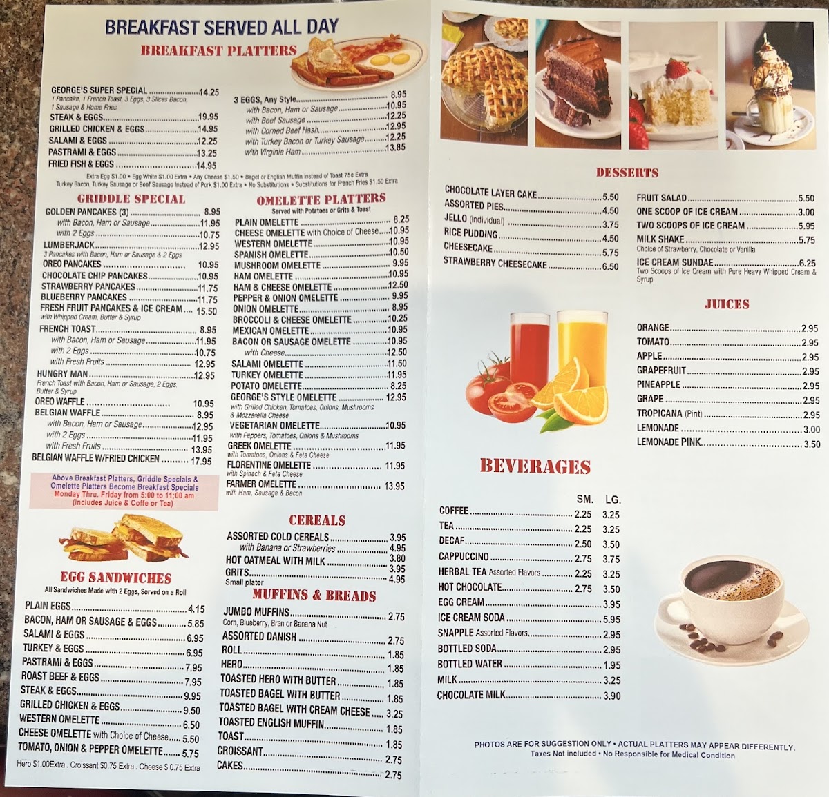 Salad platters stand out too, especially the Greek Salad with romaine, olives, feta cheese, and stuffed grape leaves, showcasing fresh Mediterranean notes. The welcoming atmosphere, complimented by attentive staff, makes every visit feel like home. Dishes such as the grilled corn muffin and the onion omelette linger fondly in memory. George’s Diner delivers not just meals, but memories—comfort food served with warmth, making it a must-visit for both locals and newcomers alike.